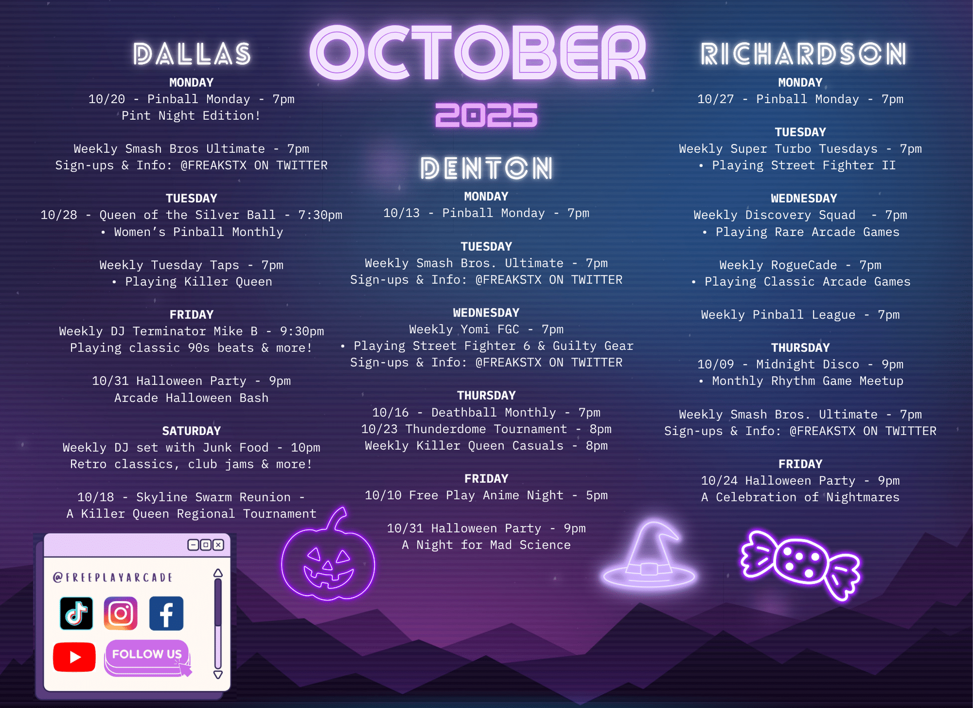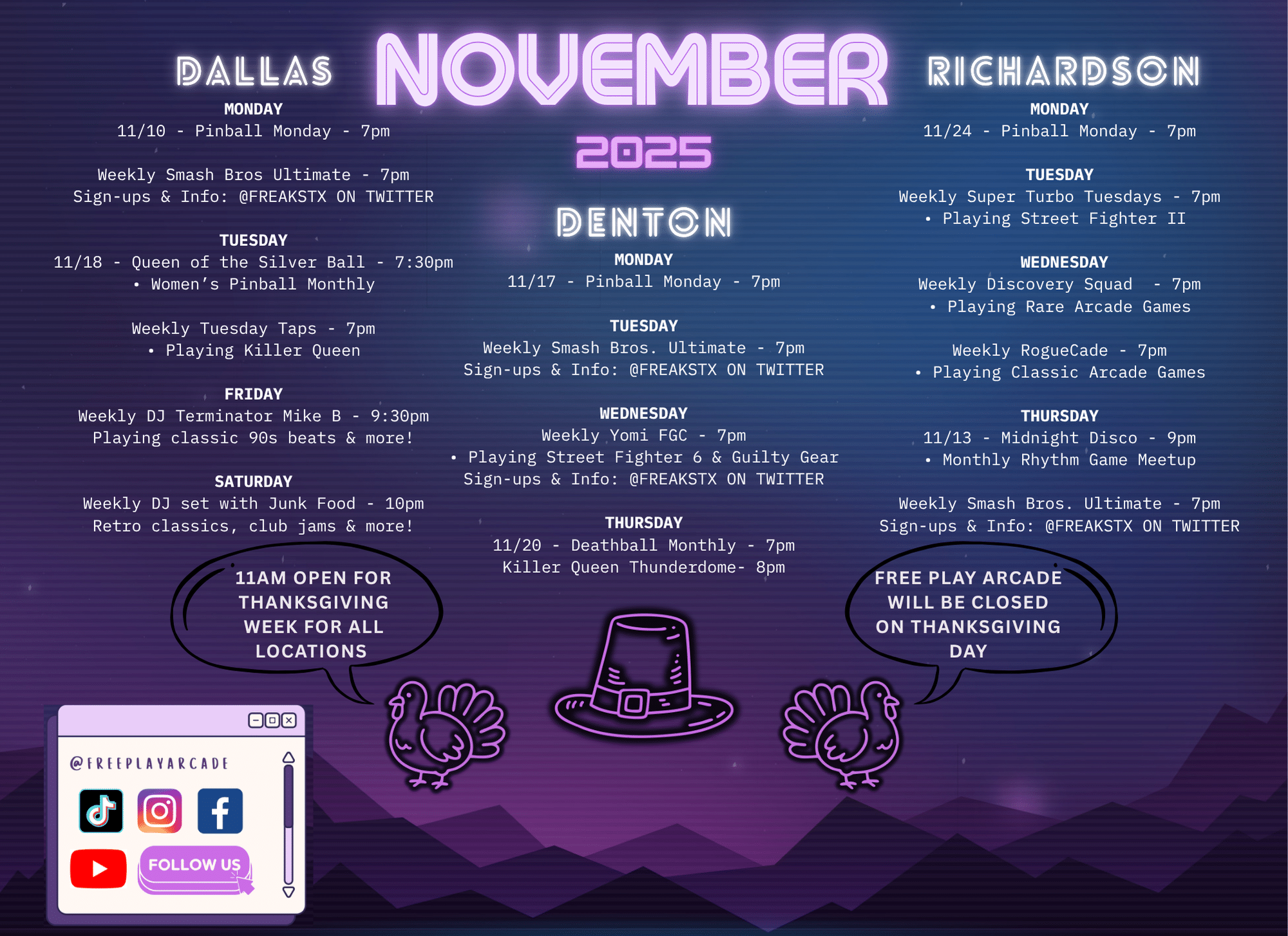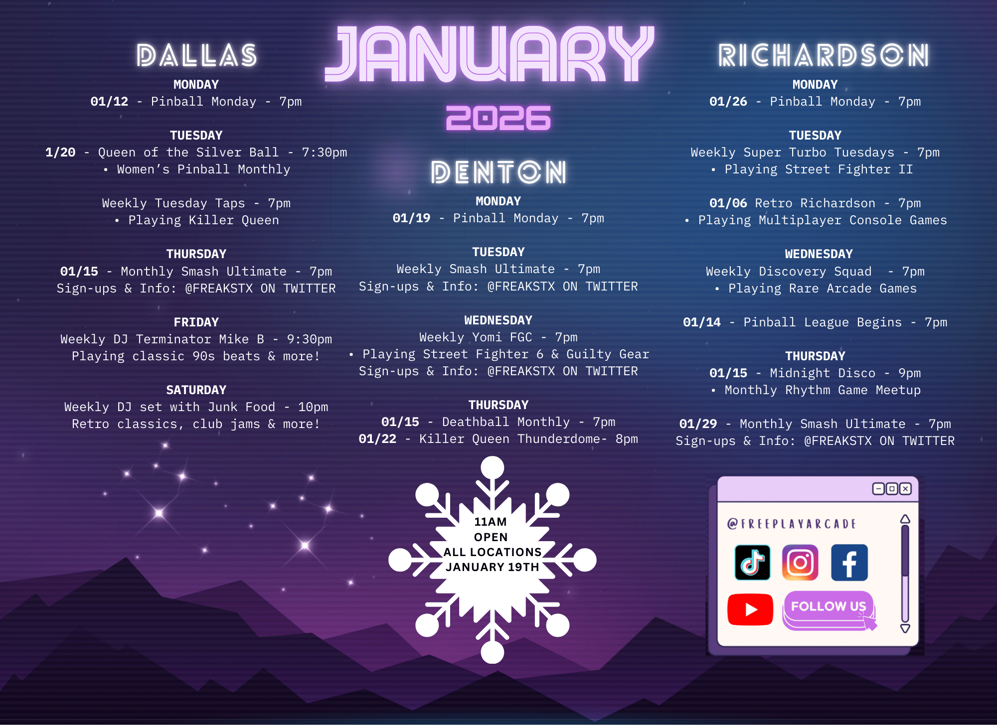 Welcome to the Free Play Event Calendar. Please note, this calendar is updated monthly and features each of our official Free Play events. For more information on these events, your best bet is to join the Free Play Arcade Community Group on Facebook, where the Free Play experts can help you discover everything there is to know about Free Play!