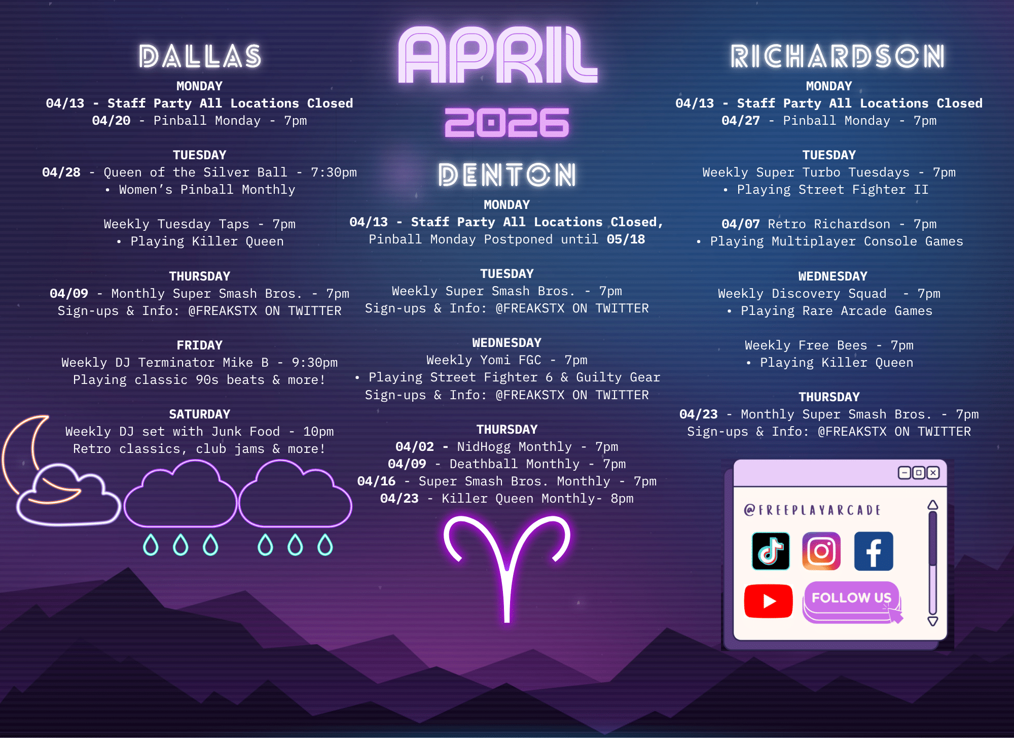 Welcome to the Free Play Event Calendar. Please note, this calendar is updated monthly and features each of our official Free Play events. For more information on these events, your best bet is to join the Free Play Arcade Community Group on Facebook, where the Free Play experts can help you discover everything there is to know about Free Play!